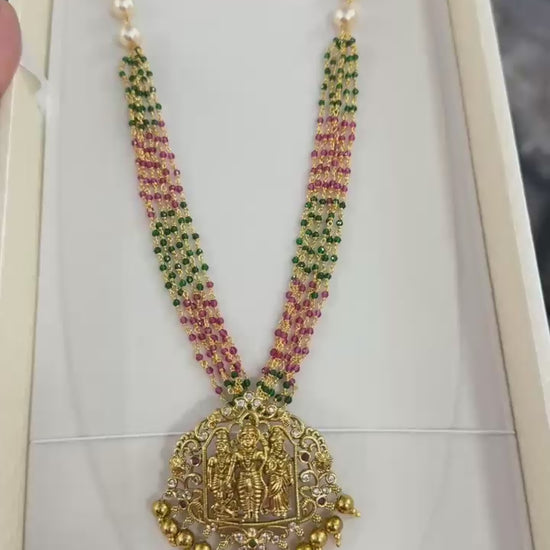 Expertly crafted and adorned with intricate details, the Goddess Lakshmi Haram is a stunning piece of jewelry. Made with precision and care, this necklace features the goddess Lakshmi, symbolizing wealth and prosperity. Let this necklace bring abundance and beauty into your life.